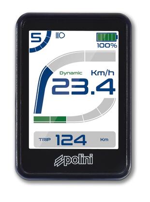 Il display TFT Polini è di facile lettura grazie a uno schermo a colori da 2,5 pollici "Adattive light", ovvero con adattamento automatico del colore e dell’intensità in base alla luce dell’ambiente. Inoltre mostra in maniera accurata la potenza di pedalata del ciclista, la cadenza, la potenza del motore e il residual range.