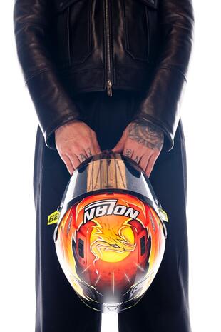 Per un pilota speciale, un casco speciale. Anzi due, due modelli integrali con la grafica particolarissima di Andrea Iannone: sulla calotta l’immagine di una fenice e la frase “like a phoenix I rise from the ashes”, cioè come una fenice risorgo dalle ceneri. Un chiaro riferimento alla sua storia agonistica, l’invito a non arrendersi mai di fronte alle avversità. Iannone come è noto è rientrato da un paio d’anni dopo un lungo stop; la nuova grafica è il simbolo della sua profonda trasformazione.
