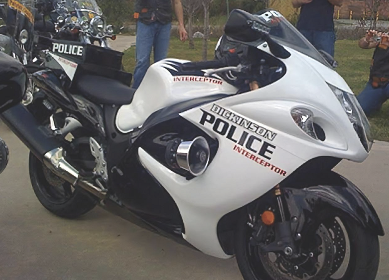 Anche la Hayabusa qui sotto è dotata di specifiche da polizia. La scritta "INTERCEPTOR" è stampata sulla fiancata. Se vi emozionate quando sentite la parola "Interceptor", potreste essere fan di Mad Max... Questa moto ha il logo del Dipartimento di Polizia di Dickinson, nel Dakota del Nord, ma non ci sono dettagli, quindi è un mistero se si tratti di un mezzo ufficiale o di una "motocicletta in stile polizia".