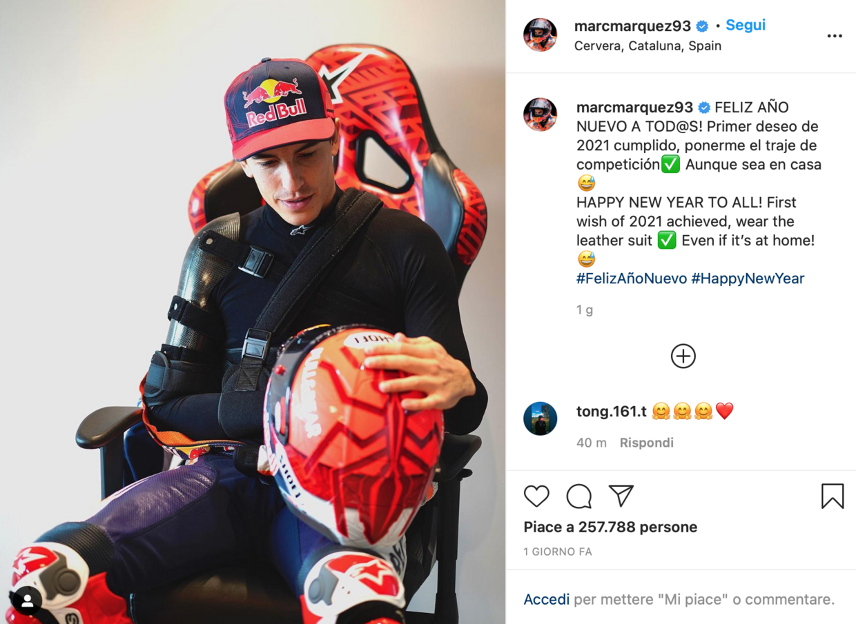 Ancora convalescente, l’otto volte campione del mondo Marc Marquez non vede l’ora di rimettersi la tuta e, finalmente, tornare in sella alla sua Honda. “Primo desiderio del 2021 realizzato - scrive Marquez sul suo profilo social mentre accarezza il casco che avrebbe dovuto indossare nella stagione 2020 - mettermi la tuta da competizione, anche se a casa”. Eh sì perché la voglia è tanta, ma la strada, purtroppo, ancora lunga: prima di tornare tra i cordoli lo spagnolo dovrà completamente rimettersi dall’infortunio e dalle tre - finora - operazioni subite al braccio destro. Da Honda non abbiamo notizie certe in proposito, anche se dello spauracchio di una quarta operazione vi avevamo già accennato qualcosa durante gli ultimi giorni del 2020. A metà dicembre, dopo la terza operazione al braccio infortunato a Jerez, Marc, rimaneva infatti ancora ben lontano dall'uscire dal tunnel. Dopo i primi due interventi, effettuati a qualche settimana di distanza, prima per l’inserimento della placca e poi per la sostituzione a causa rottura della stessa, il recupero è stato più lento del previsto. Per questo lo spagnolo nei giorni scorsi è tornato sotto i ferri per la terza operazione, questa volta a Madrid e non più a Barcellona come nei primi due casi, cambiando così la squadra medica di riferimento. Nel corso di questa operazione è stata riscontrata un'infezione ossea, quest'altra difficoltà potrebbe rallentare i tempi di recupero dell’otto volte iridato… Il quadro, per il momento, non è purtroppo dei migliori, ma la voglia di tornare in pista davvero incontenibile: difficile denere fermo in campione come Marc per tutto questo tempo. Mai come oggi, gli facciamo tutti i nostri auguri di prontissima guarigione!