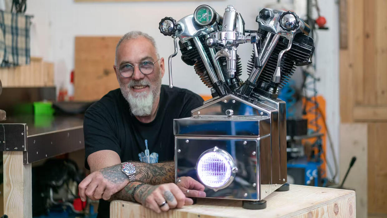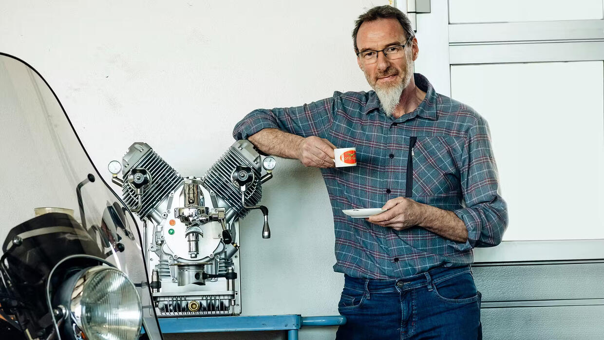 Ha incominciato Manfred Buchner. Prima preparava e personalizzava motociclette a Possenhofen, in Germania; adesso ha convertito la sua attività nella produzione di macchine per caffè espresso costruite sulla base del motore Harley Davidson Knucklehead. Il bicilindrico a V americano viene modificato con l’applicazione di un gruppo di erogazione E61 e un sistema a doppio circuito acquistati da fornitori italiani, ci sono una cassa in acciaio inossidabile e un vetro di sicurezza, gli alloggiamenti dei bilancieri vengono trasformati in modo che uno fornisca acqua calda e l’altro vapore. Le canne dei cilindri sono verniciate a polvere per evitare la corrosione. Non è una stravaganza da Archimede Pitagorico ma l’inizio di una vera e propria produzione: la macchina si chiama Motormaschine e Buchner l’ha presentata all’Intermot di Monaco con il marchio Café Racer. Pesa circa 45 kg, è alta 65 cm e costa 8990 €.