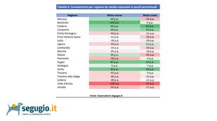 Analizzando la situazione per regioni, lascia di stucco la Basilicata con una crescita del 104% sul nuovo e il pareggio sull’usato, vanno bene anche Puglia e Sicilia (rispettivamente 87 e 85% sul nuovo, 53 e 56% sull’usato), mentre accusano il colpo il Piemonte (-56% e -4%), il Veneto (-55% e -27%), l’Emilia-Romagna (-43% e -21%), la Liguria(-43% e +11%) e in maniera sorprendente la Valle d’Aosta (-109% e -57%).