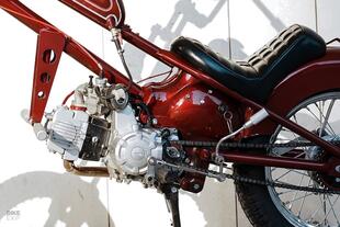 È cambiato quasi tutto, non solo il motore. Il telaio originale è stato tagliato, allungato e trasformato in hardtail, cioè con la parte posteriore rigida, cosicché risulta ancora più difficile riconoscere la moto di partenza. Le misure, manco a dirlo, sono cambiate radicalmente ed ora il chopper Cub ha un interasse di 1540 mm, mentre i due steli della forcella inclinatissima sono lunghi la bellezza di 94 mm. Le ruote sono entrambe di 18”, un rinforzo in alluminio fatto a mano incrementa la rigidità dell’avantreno. Sulle piastre di forcella lavorate a CNC ci sono riser a osso di cane che fissano ancora più in alto il manubrio realizzato su misura.