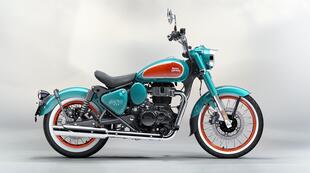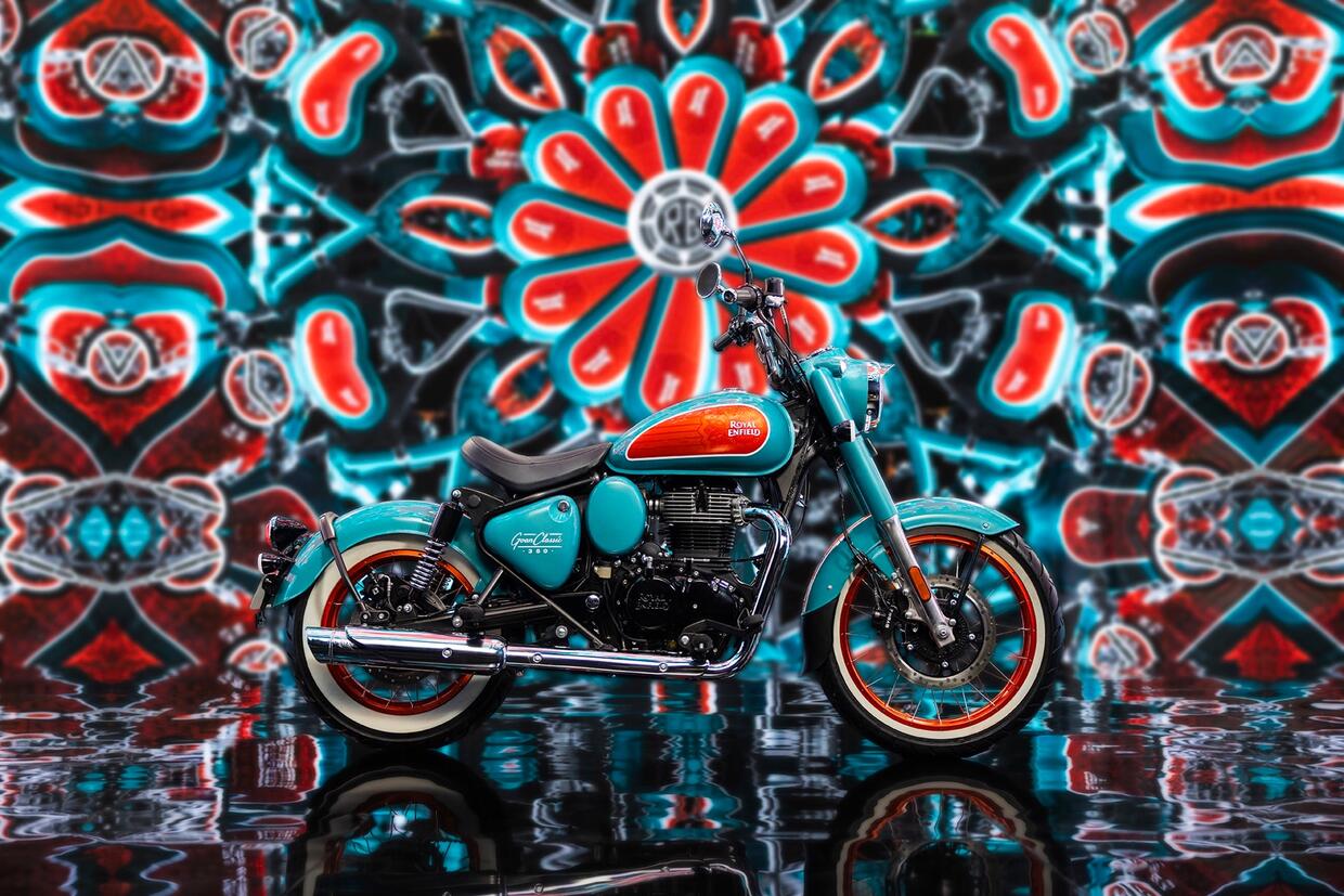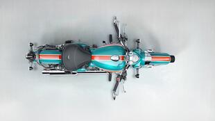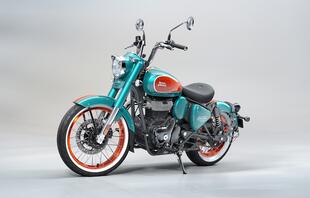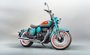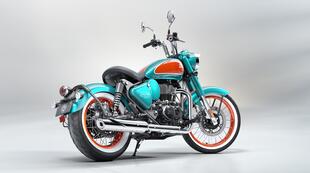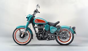 Difficile passare inosservati con una moto come questa: la Goan Classic 350 è l’interpretazione in chiave indiana di una bobber secondo Royal Enfield. Rutilante di colori della sua colorazione Trip Teal ispirata alla tradizione mandala, con tonalità a contrasto dall’arancione al verde acqua, a cui si aggiungono silenziatori slash-cut e dettagli cromati che conferiscono alla moto un inconfondibile look bobber. È stata disegnata con l’intento di esprimere uno spirito all’insegna della libertà e per questo ci sono richiami allo stile Chopper come nei parafanghi, nel manubrio ape hanger, nella sella rialzata in posizione ergonomica che di serie è biposto ma è disponibile anche monoposto optional, e completano un’immagine originalissima gli pneumatici neri con spalla bianca su ruote rosse che creano un originalissimo effetto tricolore.
