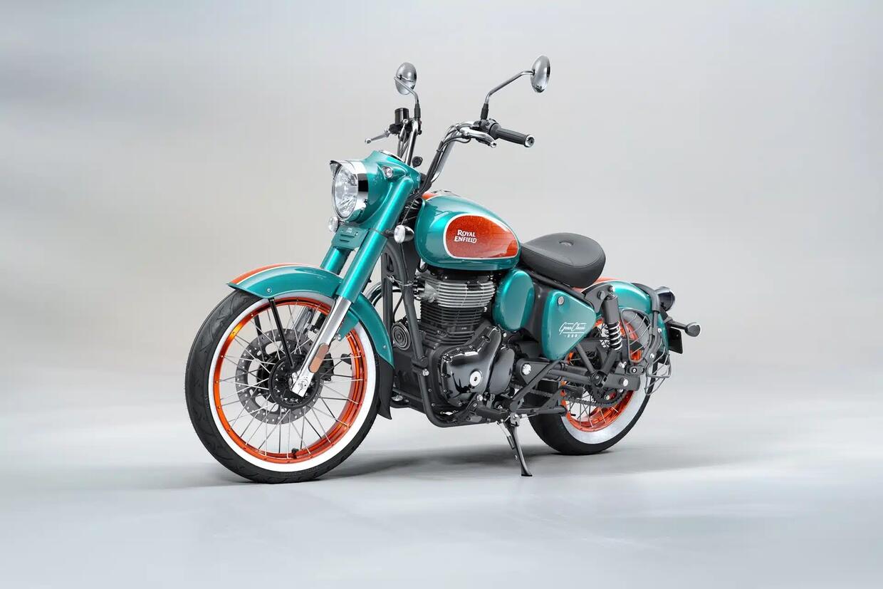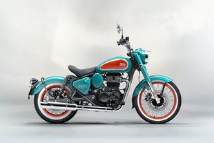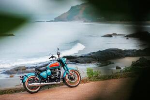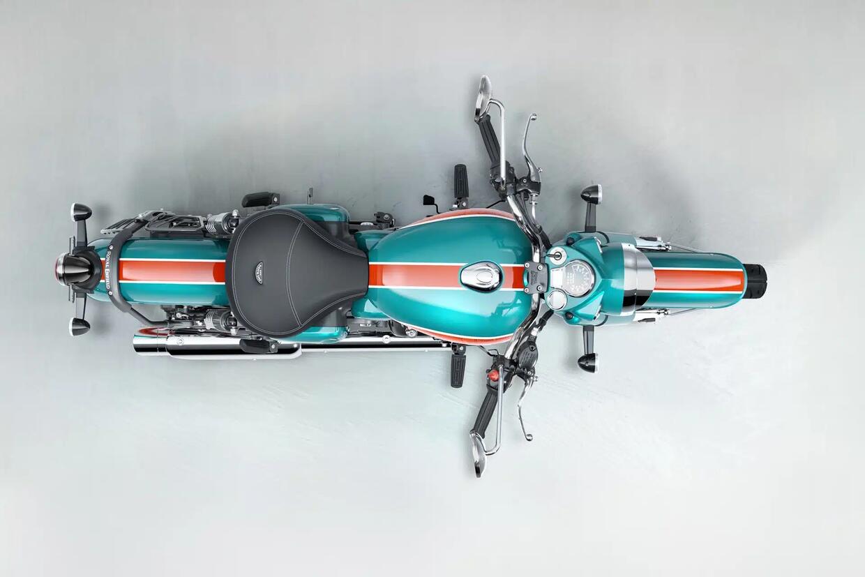 Svelata in anteprima durante il Motoverse 2024, la Royal Enfield Goan 350 si ispira allo stile bobber minimalista, rielaborato in chiave vintage. Tra gli elementi distintivi spiccano il parafango anteriore avvolgente, il manubrio alto “ape hanger” e il caratteristico sedile monoposto flottante, che richiamano le custom artigianali nate sulle spiagge di Goa, il più piccolo Stato federato dell'India. La colorazione "Trip Teal", ispirata ai motivi dei mandala (parola che deriva dal sanscrito e significa "cerchio" o "centro sacro), unisce toni vivaci come l’arancione e il verde azzurro, abbinati a dettagli cromati e scarichi tagliati "a fetta di salame", per un look inconfondibilmente bobber.