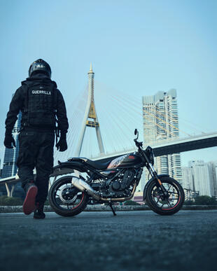 Sul fronte estetico arrivano le livree APEX Red e APEX Black, che si affiancano alle già disponibili Twilight Blue e Shadow Ash, con coprisella sagomato e cupolino anteriore in tinta a completare il look. Assiema alla Apex, Royal Enfield ha presentato una collaborazione con Fairtex, marchio thailandese specializzato in materiali tecnici per sport da combattimento, nello specifico per la Muay Thai: il risultato è una versione speciale della APEX nei colori della partnership, più una linea co-branded con guanti da boxe e pantaloncini da allenamento. L'abbinamento moto-sport da combattimento è insolito, ma lei, va detto, no si chiama Guerrilla per caso.