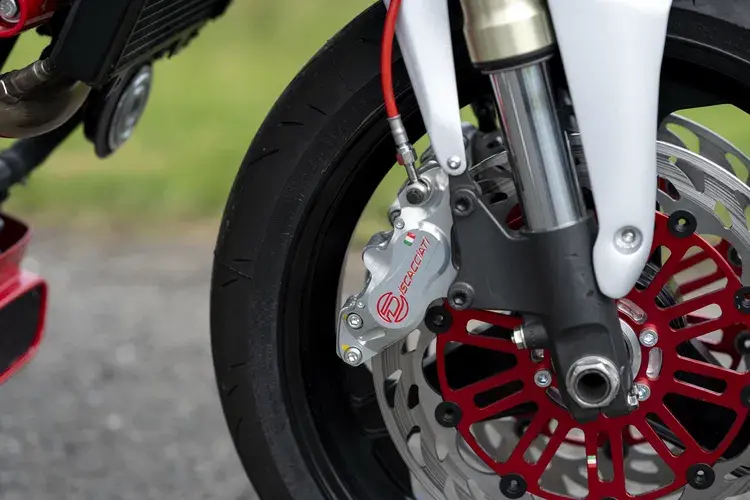 La ciclistica prevede una forcella Showa da 43 mm regolabile in estensione e compressione, montata su piastre di sterzo S&P ricavate dal pieno. Al posteriore troviamo un monoammortizzatore Nitron R1 sviluppato su misura. L’impianto frenante combina pinze Discacciati e pompa radiale all’anteriore con un impianto posteriore Brembo su disco NG. Le ruote sono DYMAG CH3A a tre razze in alluminio forgiato. Il lavoro sul design è stato realizzato con la collaborazione dello studio torinese FUTURA 2000 e di Alberto Caimi. Il corpo centrale della moto, scolpito partendo da un bozzetto originale di Rosell, è stato prima modellato in 3D e poi realizzato tramite stampa e stampi. Altro che indicatore della riserva: il serbatoio presenta una finestra trasparente per il controllo del livello carburante e tutta l’elettronica è nascosta sotto la sella. Chiude il pacchetto uno scarico artigianale XPIPE in acciaio da 45 mm con terminale Spark in titanio e carbonio, capace di offrire un sound aggressivo, in linea con l’estetica essenziale e muscolosa della GRR.