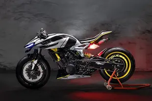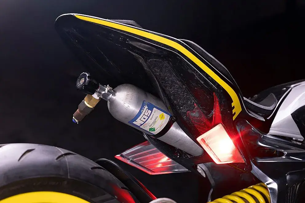 Il frontale è dominato da una carenatura aggressiva con due alette che ricordano le superbike e le streetfighter moderne. La posizione della carena è regolabile, così la moto può essere configurata per l'uso stradale o per le gare di drag. Dietro c'è una coda affilata con sella stampata in 3D . La bombola Nos sotto la coda non è lì per bellezza: funziona davvero. "Sottolinea che questa special è pensata per performare, non solo per fare scena", precisa Nanda. Gli indicatori di direzione posteriori sono integrati nelle alette del fanale, aggiungendo un tocco da anime giapponese.
