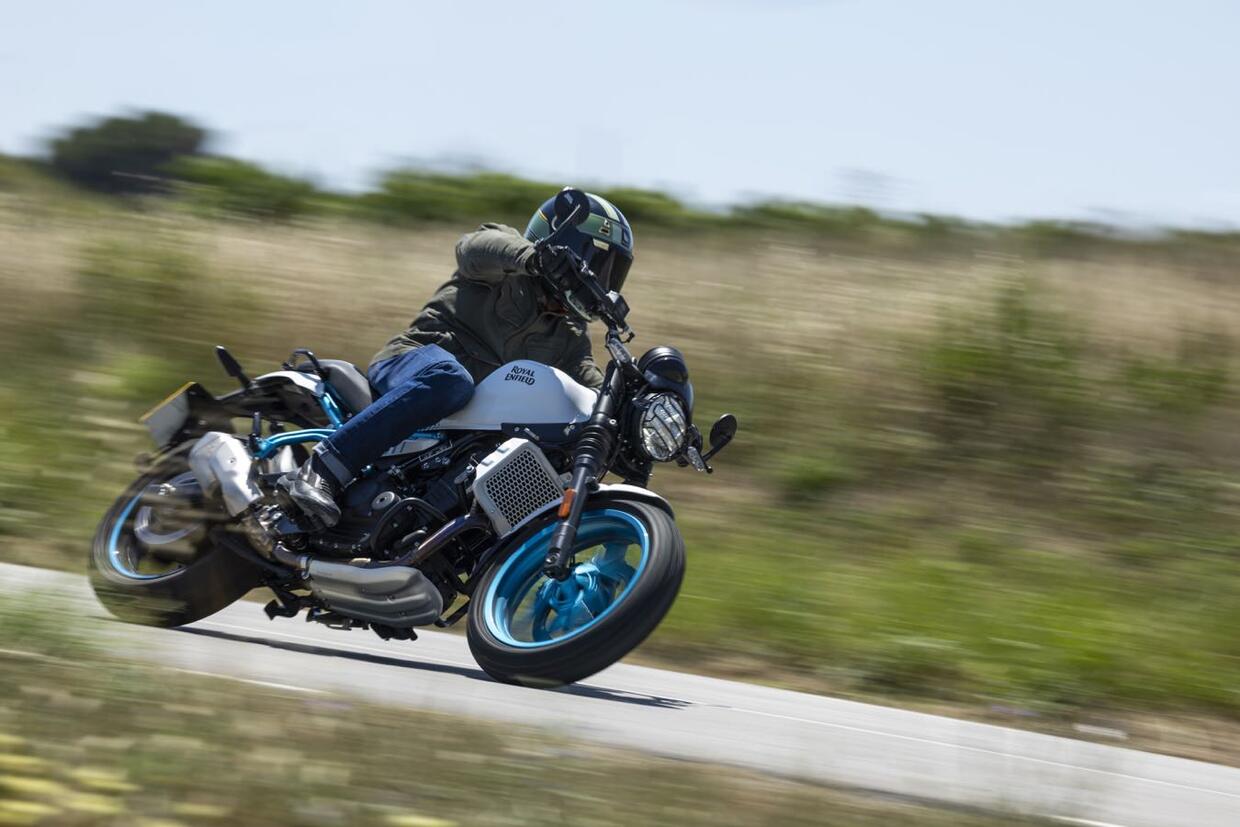 Il telaio in acciaio tubolare è condiviso con l’Himalayan, ma qui è abbinato a quote più svelte: interasse accorciato, inclinazione del cannotto ridotta (21,5°) e forcella tradizionale che alleggerisce l’avantreno. Nel misto stretto, la Guerrilla è agile e sincera. La stabilità resta comunque elevata anche ad andature sostenute. L’impianto frenante è firmato ByBre, con ABS a due canali e disco singolo sia all’anteriore (310 mm) che al posteriore (270 mm): la frenata è ben modulabile.