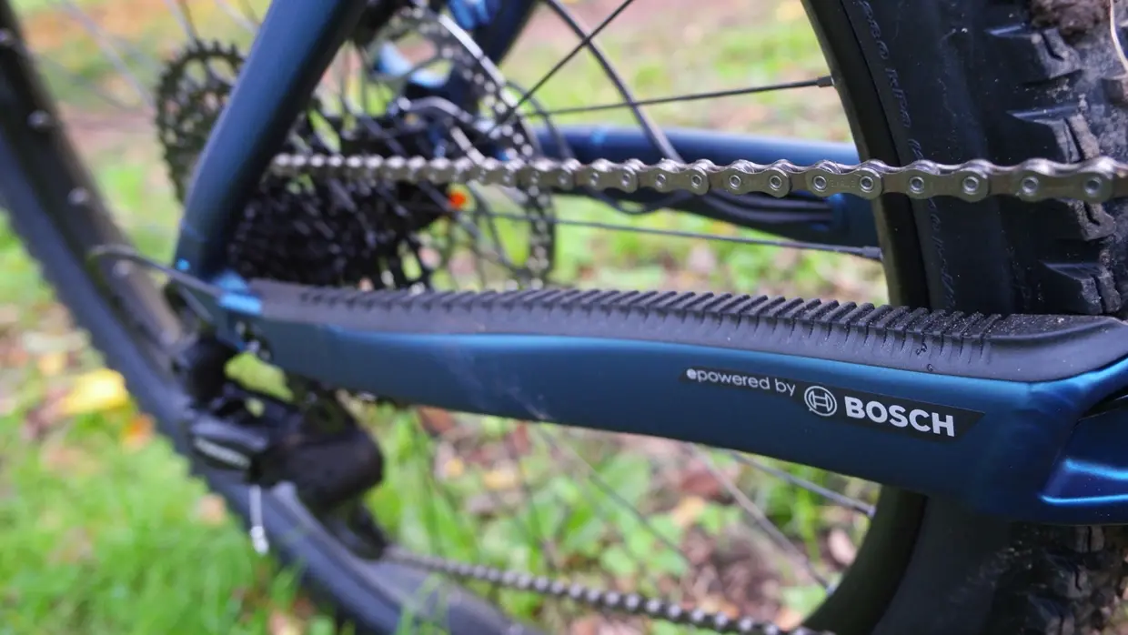 Un robusto batticatena in gomma protegge il fodero inferiore; a destra il compatto display Bosch Purion.