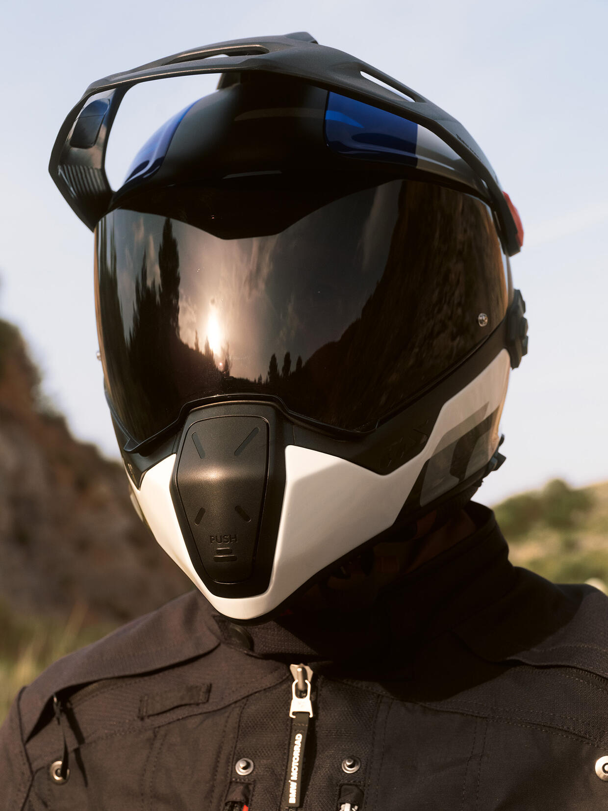Il sistema di ventilazione opera nella parte superiore della testa ed è dotato di protezione insetti, quello della mentoniera è protetto da un filtro antipolvere. Una mentoniera rimovibile assicura un abbondante flusso d’aria per il fuoristrada e le giornate calde. Anche la visiera comunque è rimovibile, oppure sostituibile velocemente, grazie al meccanismo Quick Release; è dotata di meccanismo autobloccante e di una regolazione dedicata al traffico urbano, in più c’è la visiera parasole regolabile. Di serie viene installata una visiera con lente interna Pinlock 120 ma è disponibile anche una selezione con diversi colori e tonalità: arancio, blu specchiato, argento specchiato, trasparente e scura, tutte con rivestimento antigraffio.