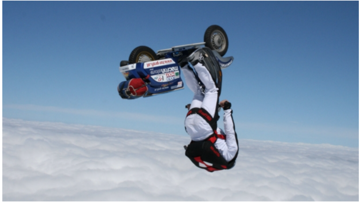 Non bastava: tra le imprese dello skydriver - e ovviamente anche della sua amata Vespa - annoveriamo anche un salto nel vuoto dall’altezza di 4.000 metri. Il protagonista del video qui sotto ha raggiunto la quota prefissa, ha aperto il portellone e si è lanciato: a parte lo scarto di circa 34mila metri in meno, la differenza sta in questo caso nel fatto che Schachermayr s’è divertito a “volare” in sella alla Vespa, anche lei ovviamente equipaggiata del suo paracadute. Lo stuntman sembra “surfare” tra le nuvole, esibendosi in acrobazie e manovre spettacolari. Non sappiamo esattamente quale record sia stato infranto: entrambi i video, però, meritano di essere guardati anche solo per farsi una risata (nel primo specialmente Günter sembra divertirsi un mondo!)
