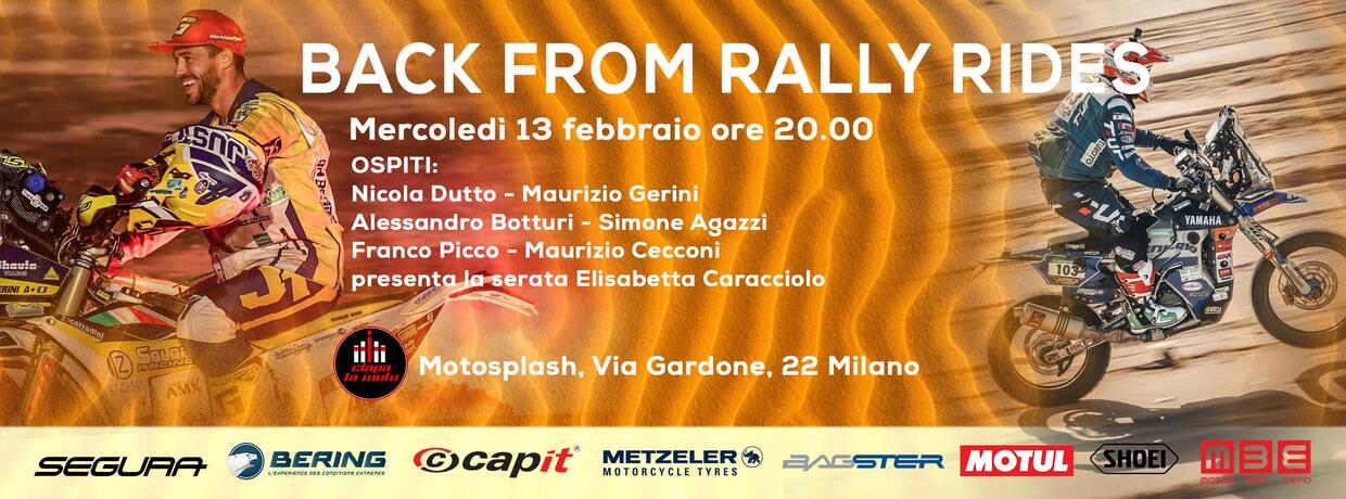Nonostante l'inverno che non concede tregua, da Motosplash soffiano venti da deserto infocato: per la gioia degli amanti dei rally e non solo, gli spazi dell’associazione Ciapa la Moto ospiteranno infatti mercoledì 13 febbraio i coraggiosi, vittoriosi e valorosi reduci dell’Africa Eco Race e della Dakar 2019. Pronti a raccontare delle avventure vissute al di là del mare, sul palco saliranno Alessandro Botturi, vincitore dell’Africa Eco Race 2019, Maurizio Gerini 14° posto assoluto e 1° posto nella classifica Marathon, Simone Agazzi, 3° classificato all’Africa Eco Race 2019, Paolo Ceci, vincitore dell’Africa Eco Race nel 2018, Sara Bioli, Nicola Dutto, primo pilota con paraplegia ad aver partecipato alla Dakar, Franco Picco con i suoi 63 anni e 10° assoluto all’Africa Eco Race e alla sua 26esima sfida con il rally raid più lunghi e impegnativi del panorama internazionale e Maurizio Cecconi, tornato in Africa dopo 30 anni per conquistarsi un gran bel 12° posto. A presentare la serata “Back from rally rides” ci penserà Elisabetta Caracciolo che, inviata di WRR all’Africa Eco Race, ha condiviso con i piloti parte dell’avventura africana, caldo torrido e sabbia negli stivali inclusi.