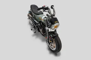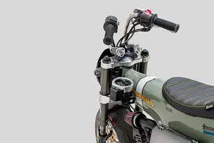 Dal punto di vista tecnico, la Otto Dax presenta numerosi interventi su ciclistica, estetica e meccanica. Il telaio è stato sabbiato e verniciato a polvere in verde, mentre la forcella è una Gears Racing FFC-200TT con cartucce completamente regolabili. Al posteriore lavorano ammortizzatori con serbatoio separato, regolabili in precarico, estensione e altezza. Per le ruote si è scelto un set Chimera Engineering con design a quattro razze, ispirato alle ruote originali della Dax e abbinato a pneumatici Kenda Kwik KD2. Il forcellone G-Craft, realizzato in Giappone con tubi quadri, è rinforzato da un doppio traversino inferiore. L’impianto di scarico è stato sviluppato su misura da Vance & Hines, partendo da uno schizzo bidimensionale elaborato dal designer Duy Nguyen. La sella, invece, è un pezzo unico. Il posteriroe è in alluminio e integra un fanale posteriore a scomparsa. L’imbottitura è stata realizzata da Rogelio’s Auto Upholstery con rivestimento in vinile nero e cuciture gialle. Il frontale è stato completato con un faro Baja Designs montato su una staffa in alluminio ricavata dal pieno da Chimera Engineering.