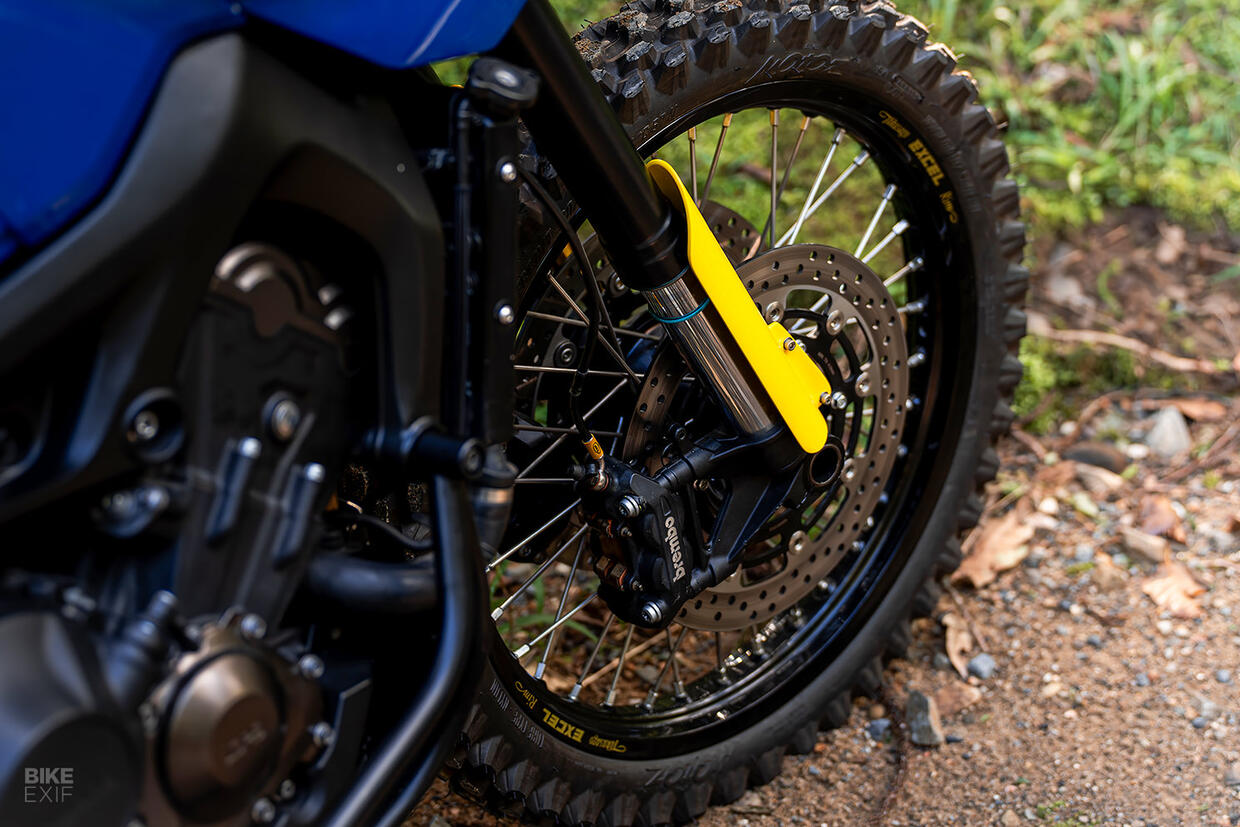 Il committente di Purpose Built Moto, appassionato del sound e della spinta dei tre cilindri, cercava una moto pronta all’avventura ma con un motore più gustoso del solito mono o bicilindrico. Partendo da una base più leggera e potente della Ténéré 700, il team ha deciso di alzare la ciclistica, rinforzare le sospensioni e adottare ruote e pneumatici adatti all’off-road. L’anteriore è stato affidato a una forcella derivata da quella di una KTM 1190 Adventure, mentre al posteriore è stato stato necessario un intervento più profondo, con un monoammortizzatore realizzato su misura e un nuovo leveraggio progettato ex novo.