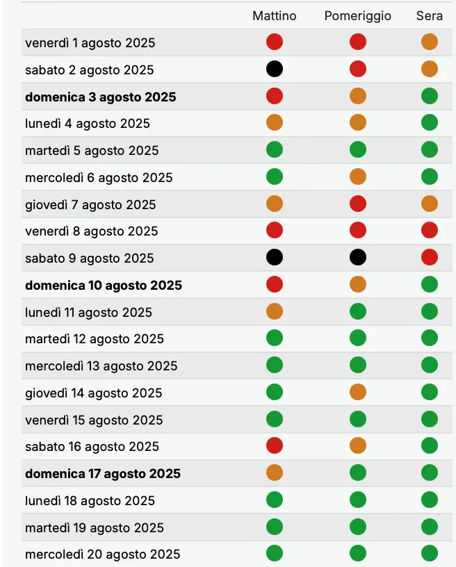 - Lunedì 18 agosto: verde mattino, verde pomeriggio, verde sera (situazione regolare).