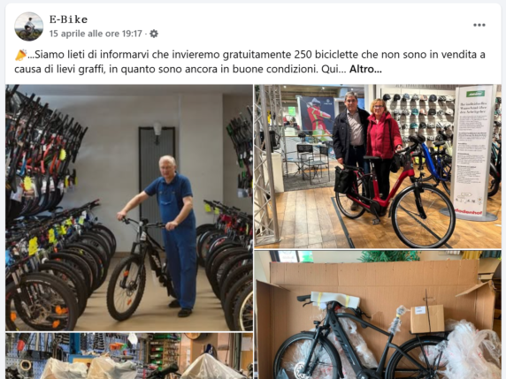L’annuncio è sempre lo stesso: 250 biciclette elettriche “da regalare” perché rovinate da piccoli graffi. Il messaggio, spesso in spagnolo e tradotto automaticamente in italiano, è accompagnato da foto verosimili – alcune autentiche, altre chiaramente generate dall’intelligenza artificiale. Basta commentare con un semplice “grazie” e si entra, apparentemente, nella lista dei fortunati vincitori.