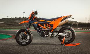È cambiata tanto anche l’elettronica che ora dispone di ABS e controllo di trazione cornering e il nuovo Dynamic Slip Adjust (con modalità Rally optional), gestiti dal nuovo display TFT da 4,2”. Interventi analoghi sulla SMC che fondamentalmente è la stessa moto, fatte salve tutte le differenze necessarie per l’impiego su asfalto, così in questo caso la piattaforma a sei assi permette l’inserimento della modalità Track per attivare altre impostazioni come il launch control, l’anti- wheelie, il regolatore di slittamento e la regolazione del freno motore.