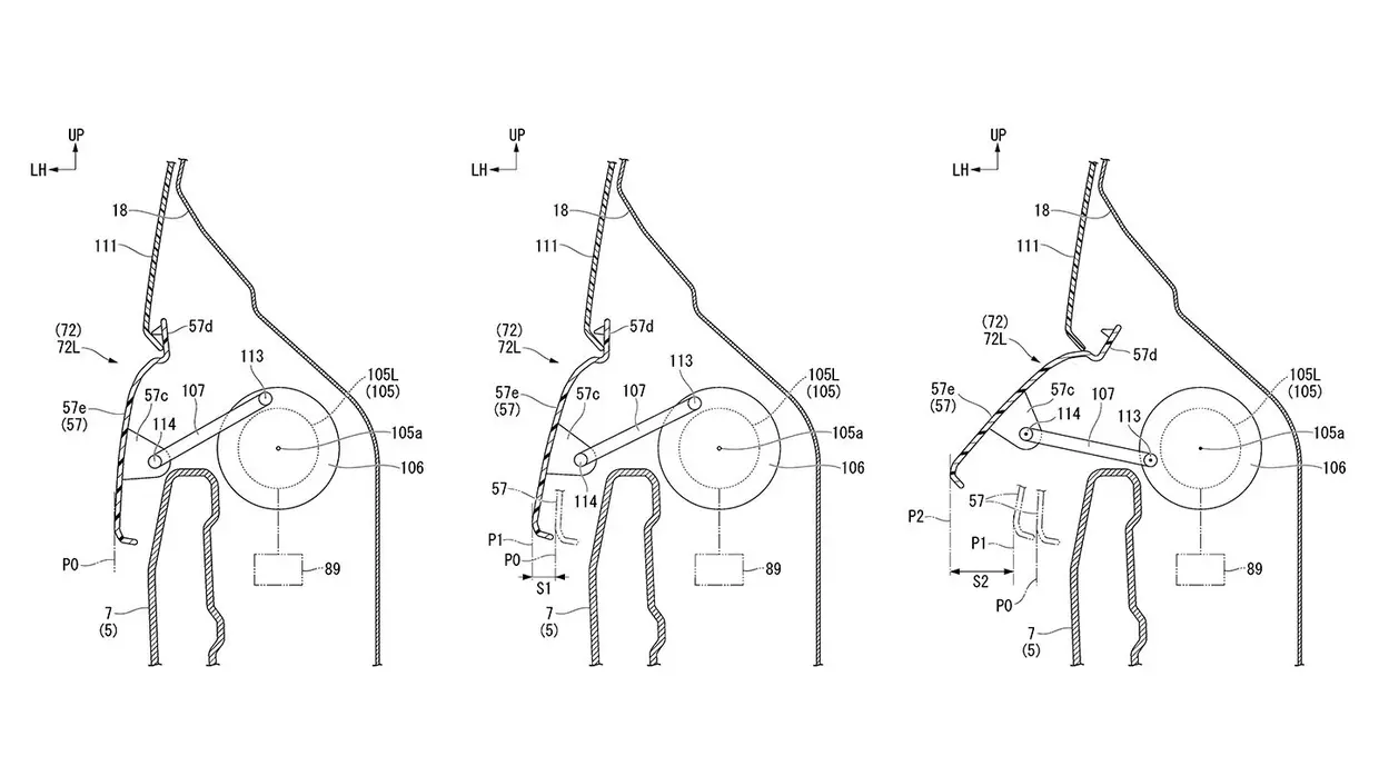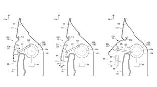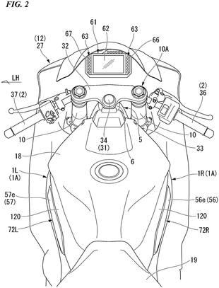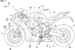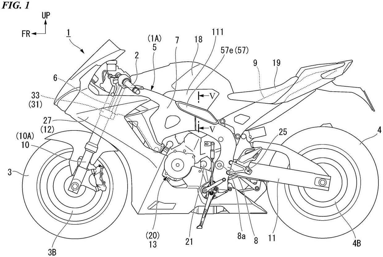 Si viene a creare dunque il problema di rendere consapevole chi è alla guida dell’intervento dei dispositivi di sicurezza e a questo riguardo Honda ha già depositato alcuni brevetti in Europa. La Casa di Tokyo sta lavorando all’utilizzo di sezioni attive della carrozzeria che spingono contro l’interno delle cosce, segnalando l’intervento e aiutando il pilota ad assumere una posizione in sella più adatta alla situazione presente. È meno complicato di quanto può sembrare: i disegni depositati illustrano una CBR1000RR nella quale sono stati installati pannelli mobili sul fianco del serbatoio, nel punto in cui le ginocchia fanno presa per ancorarsi. Sono incernierati lungo i bordi superiori e dietro di essi c’è un attuatore rotante che li spinge in fuori nel momento in cui un dispositivo di sicurezza viene attivato.