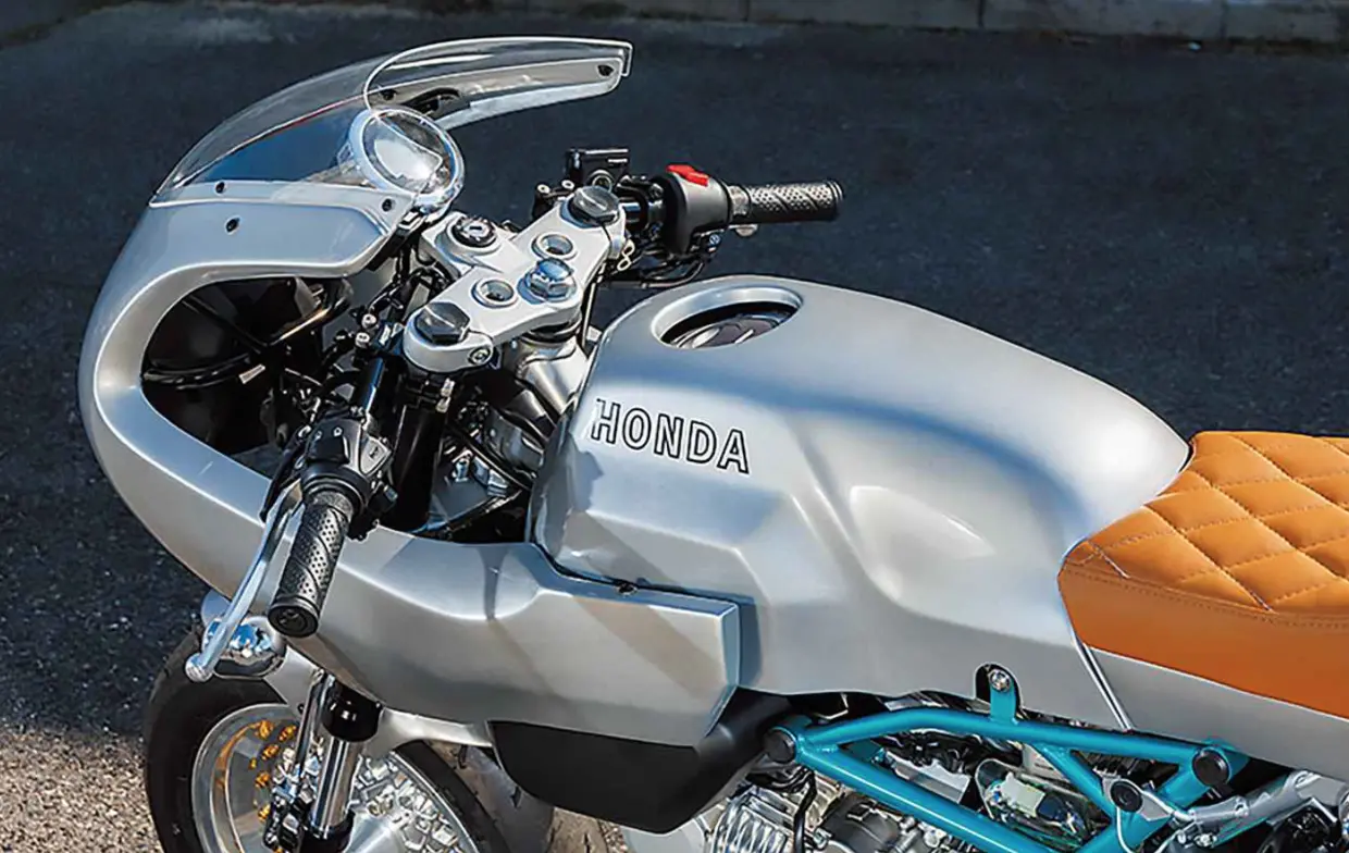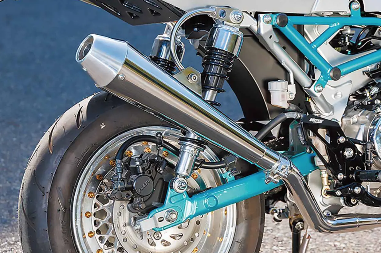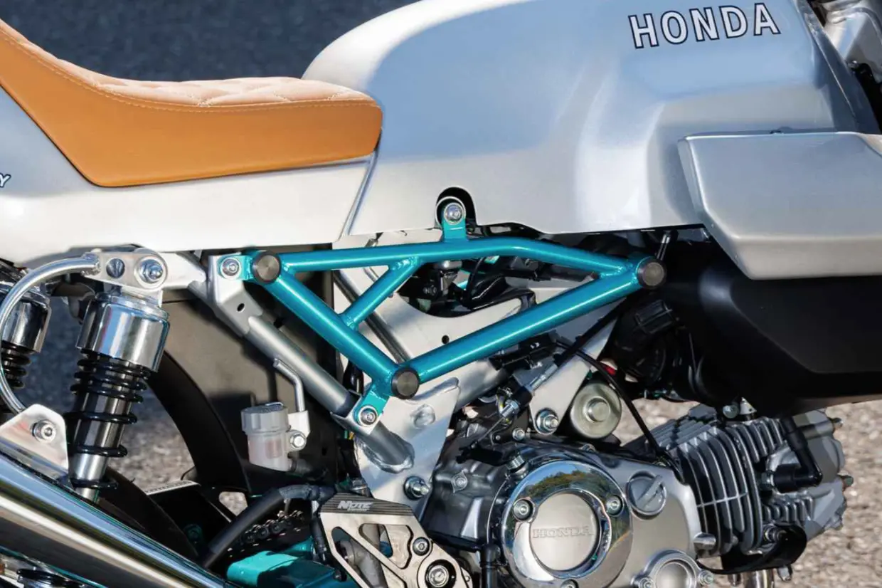 La carenatura è riprodotta con grande cura, mantenendo la possibilità di utilizzare fari e indicatori di direzione originali della Monkey 125. Il serbatoio, perfettamente modellato, riporta il logo “HONDA” scritto però con un carattere grafico che richiama quello della Ducati Paul Smart. Il manubrio è stato sostituito con un tipo in due pezzi, più sportivo, mentre nella zona del filtro è stato aggiunto un telaio secondario ispirato al traliccio tipico delle Ducati. Il terminale di scarico originale è stato invece sostituito con un elegante megafono, più adatto a valorizzare la linea retrò.