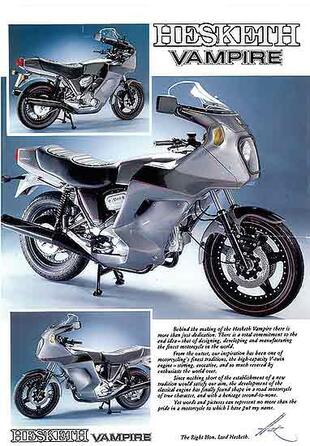 Ereditato il titolo di Lord e, con esso, l’immensa fortuna del padre, Thomas Alexander Fermor-Hesketh fu, a cavallo degli anni Settanta e Ottanta, l’emblema del nobile dandy innamorato della bella vita, delle belle donne, del lusso, dello champagne e, ecco ciò che davvero ci interessa, dei motori e delle corse. All’età di 22 anni decise di impegnare una buona parte della sua immensa fortuna per fondare il team privato di F1. Al volante della monoposto progettata da Harvey Postlethwaite, il giovane e promettente pilota James Hunt vinse nel 1975, cioè un anno dopo il debutto, il GP d’Olanda. Successo che incoraggiò Lord Hesketh - che tra parentesi era anche un grande appassionato di Vincent e Brough Superior - a gettarsi in una nuova impresa volta a ridare lustro al motociclismo inglese, in quegli anni sopraffatto delle agguerrite giapponesi.
