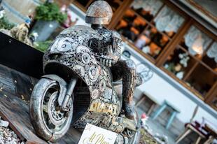 Se poi le Vespa, le moto e le auto d’epoca le volete vedere, l’albergo ha anche il suo museo, aperto tutti i giorni dalle 10 alle 19, in cui sono esposte 17 Vespa e 35 tra auto e moto, ma anche 283 orologi, più di 80 macinini da caffè, maschere di legno intagliate a mano, cappelli storici, sci e pattini antichi, pipe, porcellane, e in sala da pranzo una famiglia di sei statue di legno a grandezza naturale che vi tiene compagnia.