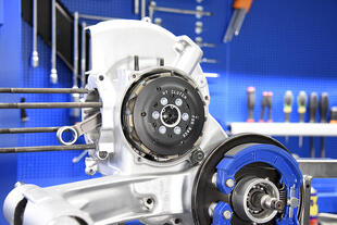 Ha una struttura completamente diversa da quella originale perché il funzionamento è invertito, cioè la parte collegata all’albero motore non è più la campana esterna ma il mozzo interno. La denominazione ufficiale è frizione Polini HT for Race, ha la campana in alluminio, il coperchio ricavato dal pieno con canale raccolta olio e lo spingidisco su cuscinetto assiale. È dimensionata per trasmettere potenze superiori a quelle disponibili di serie perché i dischi in alluminio a 8 denti hanno una superficie maggiorata. Importantissima la possibilità di regolare il carico molla della frizione, e anche quella di scegliere la dentatura dell’ingranaggio primario per adattare i rapporti secondo necessità: a catalogo sono disponibili ingranaggi con diverse dentature.