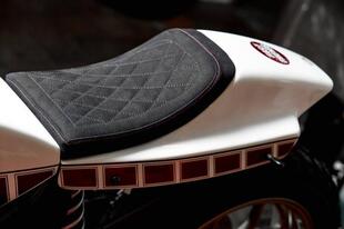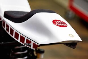 Il telaietto posteriore è stato accorciato e addobbato con un codino monoposto in fibra di vetro che fa subito AMA Grand National. Appena avanti alla coda c’è un serbatoio in alluminio nuovo di pacca: entrambi gli elementi sono decorati con gli iperclassici speedblocks di Yamaha, questa volta nei toni rossi su bianco.