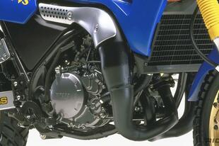 La risposta dei tecnici Yamaha arriva in fretta. Il motore è proprio quello della TZR250, un bicilindrico due tempi raffreddato a liquido con alesaggio e corsa di 56,4 x 50,0 mm, per una cilindrata di 249 cm3 ed una potenza di ben 45 CV a 9.500 giri/min. Il picco di coppia viene leggermente rivisto, passando da 3,5 kgm a 9.000 giri a 3,6 kgm a 8.500 giri, per rendere l’erogazione un filo più sfruttabile ai medi. “Iconico” lo scarico: il cross chamber, con i due espansioni che si incrociano nella parte anteriore per aumentare la lunghezza dei condotti e poi risalgono in configurazione centrale rialzata per migliorare la luce a terra.