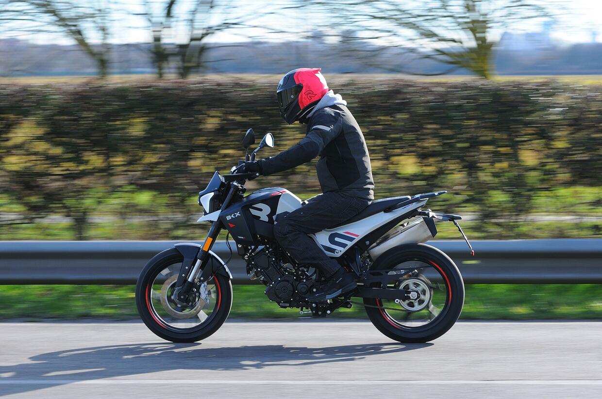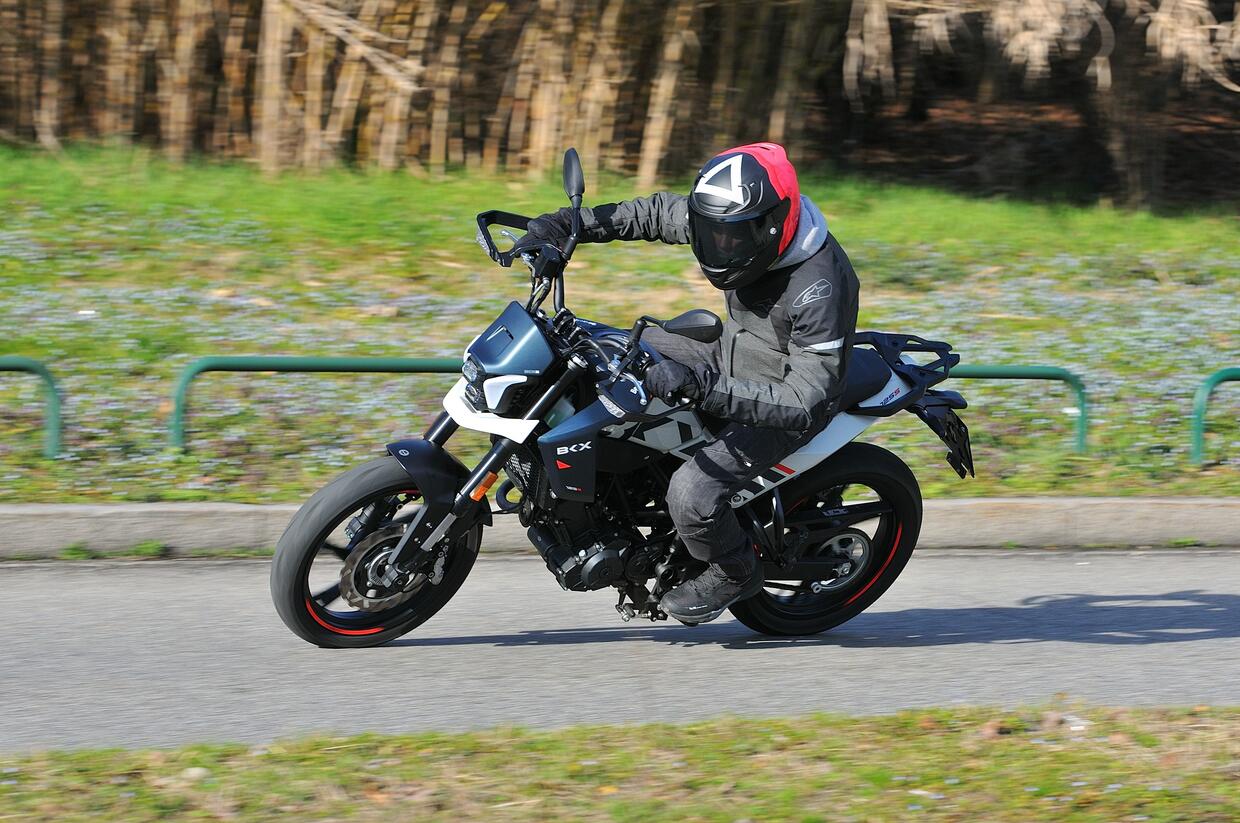 Fra le curve la BKX S risulta piacevolmente precisa e divertente: è svelta a scendere in piega, rapida nei cambi di direzione e offre un avantreno sostenuto per le prestazioni di una moto limitata a 15 CV. Inoltre, è stabile e le sospensioni non vanno in crisi quando si guida con il passeggero. Peccato per gli pneumatici di primo equipaggiamento: i CST non offrono particolare grip, specie sul bagnato.