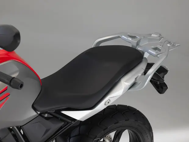 Le sovrastrutture sono "da GS" nell'aspetto e nella sostanza: la sella è ben conformata, mentre il cupolino e il serbatoio offfrono un efficace riparo dall'aria, anche per le gambe, e una posizione di guida confortevole. Ben curate le finiture, con dettagli da "grande" BMW come la piccola protezione che ripara il monoammortizzatore dallo sporco che si accumula in fuoristrada, la piastra in plastica, con logo GS, che proteggere il telaio dal contatto con gli scarponi da fuoristrada e il faretto posteriore a led. Tipicamente da GS anche il catalogo degli accessori da viaggio: per la nuova G 310 sono già disponibili il classico tris di valigie, due selle regolabili, le manopole riscaldabili e il kit per il montaggio di cellulare e navigatore. La moto sarà disponibile da metà ottobre in tre colorazioni: Cosmic Black, Racing Red (quella del test, secondo noi la più riuscita) e, con sovrapprezzo di 60 euro, in colorazione Motorsport.