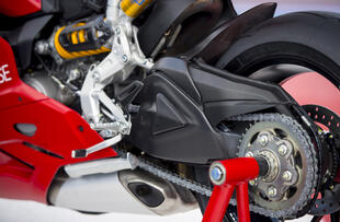 Un'altra novità della Ducati 1199 Panigale R è la possibilità di variare l’altezza del forcellone su quattro differenti altezze (da +2 a -4 mm). Le (poche) sovrastrutture della Panigale R sono arricchite da numerosi elementi in carbonio tra cui protezione forcellone, parafango posteriore, protezione mono ammortizzatore, cover carter frizione, cover blocco chiave e cover convogliatori aria. Nel prezzo da “fuoriserie” (32.000 euro) è compreso il kit racing che prevede il parabrezza “Corse” (più alto e protettivo), i tappi in alluminio per coprire i buchi degli specchi retrovisori e l’impianto di scarico della Termignoni (non omologato) che sfruttando la mappatura "dedicata" (presente nella centralina) garantisce un incremento del 3% della potenza agli alti regimi ma soprattutto di un bel 15% ai medi. Una sola la colorazione disponibile: rosso Ducati con bordi bianchi su cupolino e coda, mentre il serbatoio (parzialmente verniciato) lascia in bella mostra un ampia zona in alluminio spazzolato.Pista tecnica