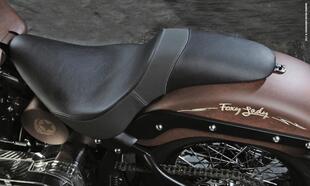 Ecco a sinistra la Foxy Lady Bobber con un manubrio normale, meno aggressiva ma più facile da guidare per chi non è "biker nell'anima". In alternativa alla sella monoposto scamosciata bianca della moto del test, si può avere la sella biposto (nella foto a destra) per brevi spostamenti in coppia.