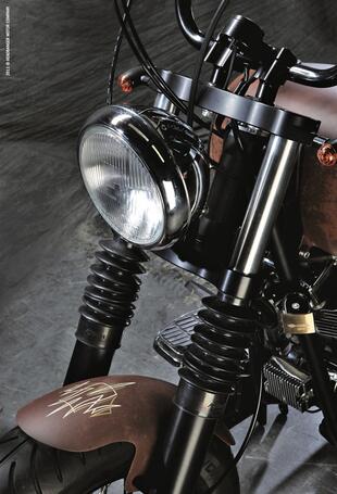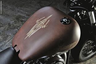 Le decorazioni a "pinstriping" sulla carrozzeria (dipinta in uno strano e azzeccato color ruggine) sono realizzate rigorosamente a mano. Ovviamente la verniciatura può essere richiesta in qualsiasi colore a scelta dell'acquirente. Il serbatoio tiene 18 litri.