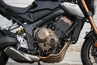 Il quattro cilindri in linea adotta coperchi motore e testata con colorazione bronzo. La forcella è una Showa a steli rovesciati di 41 mm non regolabileIn sella alla CB 650R si sta comodi, il manubrio è alla giusta altezza e offre un buon controllo. Bene anche la posizione delle pedane che permettono di adottare una guida sportiva senza compromettere il comfort: solo chi è sopra il metro e ottantacinque potrà trovare leggermente sacrificata la posizione delle gambe. Il motore è pastoso e tranquillo ai bassi e ai medi regimi, ad andatura normale si “trotterella” senza strappi. Se invece ci si vuole divertire bisogna puntare in alto: la "cattiveria" del quattro cilindri è tutta sopra quota 7.000 giri, dove ci sono CV e coppia in quantità.