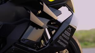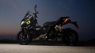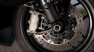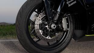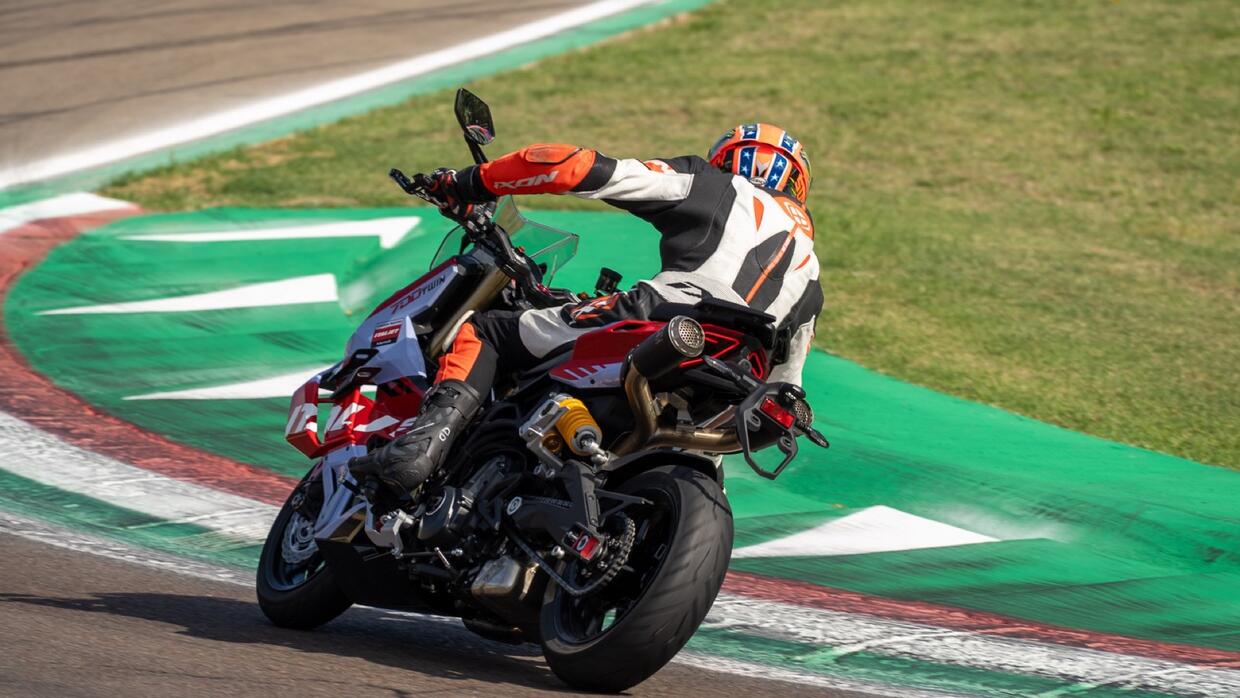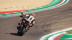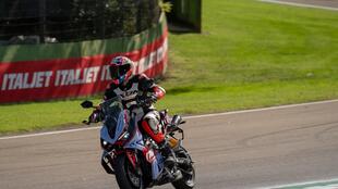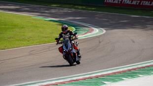 Merito anche del freno anteriore, modulabile e potente il giusto (alcuni colleghi hanno dovuto lottare con il surriscaldamento dell'impianto e conseguente allungamento della corsa della leva: noi siamo stati i primi a scendere in pista e nei soli tre giri a disposizione non c'è stato il tempo di metterlo così in crisi). Entusiasmante anche il motore, che allunga con brio e invoglia a sfiorare il limitatore ad ogni cambiata. Ciliegina sulla torta sarebbe stato il quick shift, azzeccato su un mezzo così estremo. Buona la taratura delle sospensioni, sostenuta il giusto per divertirsi senza però risultare scomoda sulle sconnessioni. Passando sui cordoli, infatti, l'assetto rimane sempre composto e controllabile, mentre sui curvoni veloci l'avantreno tende ad alleggerirsi e muoversi leggermente, causa probabilmente il bilanciamento dei pesi più da scooter che da moto.