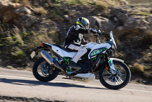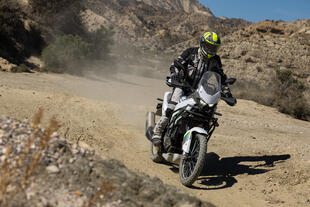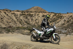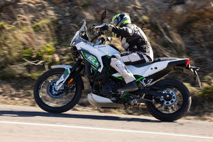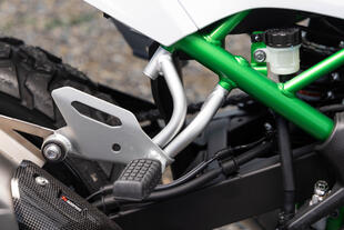 Le sospensioni confermano le aspettative. Su asfalto rovinato e fondi misti si comportano in modo onesto: morbide nell'assorbire le irregolarità, senza rimbalzi importanti nella fase di recupero. La forcella non è regolabile, ma il punto di equilibrio trovato da Kawasaki funziona bene per un utilizzo turistico-adventure. In offroad la KLE si rivela più che adeguata: ghiaia, terra battuta e sterrati facili vengono affrontati con una confidenza superiore a quanto i dati su carta lascerebbero supporre. Il limite emerge quando si cerca di spingere oltre, ma l'indole della moto è quella di andare ovunque senza troppa fretta e con facilità. L'ABS fa il suo dovere senza essere invasivo, i freni Nissin brillano per modulabilità e facilità d'uso.