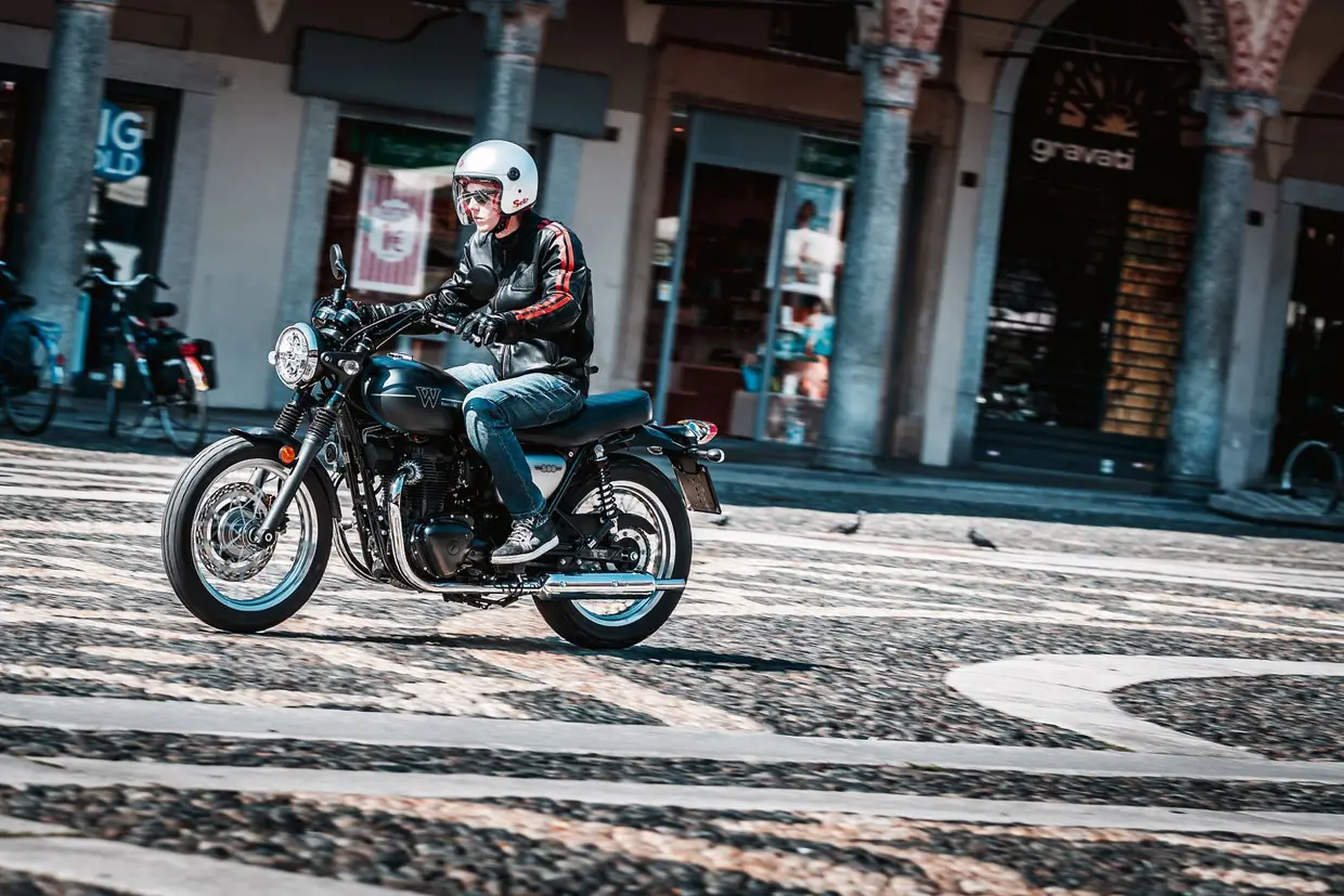 Potenziato anche l’impianto frenante: all’anteriore troviamo un disco da 320 mm morso da una pinza a due pistoncini, mentre dietro scompare il “romantico” tamburo e arriva un bel disco da 270 mm. Completano l’allestimento il faro anteriore a Led, la frizione antisaltellamento, i nuovi cerchi di sezione più larga e la nuova ruota anteriore da 18” (come quella dietro) invece che da 19”. Seppure identiche nella meccanica, le due versioni della W 800 hanno uno spirito molto diverso. Con il suo manubrio alto e largo, la sella bassa e ben imbottita, la Street è perfetta per andare “a passeggio” anche in due. La Cafe invece invoglia a guidare sportivamente, con il suo manubrio basso che costringe ad “abbracciare” il serbatoio. Entrambe lo versioni della W 800 sono già disponibili dai concessionari: la Street costa 9.840 euro, la Cafe costa invece 10.640 euro.