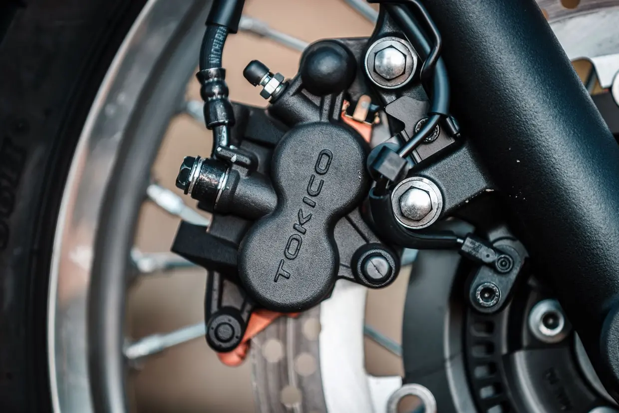 La forcella ha gli steli riparati da classici soffietti, l'impianto frenanante è a doppio disco