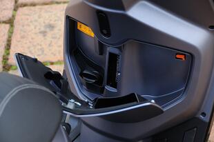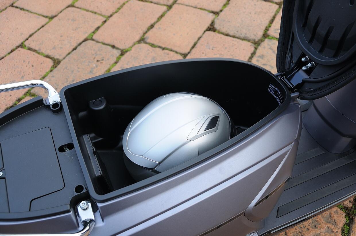 Sotto la sella c’è spazio per un casco integrale di medie dimensioni. Per il carico si può sfruttare anche la pedana piatta e larga, oltre naturalmente al grande portapacchi di serie