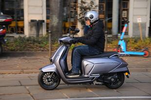 La posizione di guida è naturale, la sella lunga consente di arretrare per sistemarsi come si preferisce, ma chi è sul metro e 80 sta con le gambe un po’ rannicchiate a causa della pedana alta. Lo scudo comunque offre una discreta protezione e lo spazio per i piedi è abbondante. Nel traffico l’SC125RE è molto maneggevole: i cerchi da 12”, il baricentro basso e il manubrio stretto lo rendono facile da gestire nelle manovre e nell’impostare le curve. Le sospensioni sono un po’ rigide, ma garantiscono un assetto ben bilanciato. I freni sono pronti e adeguati al peso, l’ABS fa il suo dovere. Il motore è tranquillo, ma grazie alla trasmissione a punto offre uno scatto più che sufficiente per cavarsela in mezzo al traffico. Per parcheggiare il cavalletto centrale richiede un discreto sforzo, per fortuna di serie c’è anche la stampella laterale.