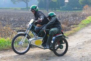 Guidare un sidecar non capita spesso, testarne uno da fuoristrada è un’esperienza unica. La tecnica di guida è completamente diversa da quella delle moto: le curve si fanno “sterzando” e non “piegando”, con il passeggero chiamato a fare la sua parte spostando il peso all’interno della curva. Se si viaggia da soli è ancora più complicato, perché la terza ruota tende a sollevarsi e va bilanciata con decisi movimenti del busto, oltre che con un attento dosaggio di sterzo e acceleratore. L’aggiunta del carrozzino comunque non penalizza molto le prestazioni del motore Daytona, si perde un pochino solo in ripresa e, soprattutto, in salita. Ma Farina ha già pronta una versione potenziata a 24 cavalli che dovrebbe risolvere il “problema”...