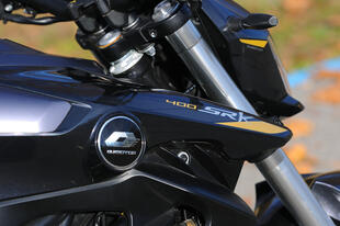 Nonostante le dimensioni compatte, la SRK 400 accoglie bene anche i piloti più alti. La sella a soli 78,5 cm da terra e i fianchi stretti permettono comunque a tutti di appoggiare saldamente i piedi a terra e gestire senza difficoltà le manovre da fermo. Il motore bicilindrico ha un’erogazione abbastanza piena a tutti i regimi: ai bassi non entusiasma, ma ai medi si fa più vivace e poi sfodera una bella grinta man mano che ci si avvicina alla zona rossa del contagiri (quando però si fanno sentire anche vibrazioni su manubrio e pedane). Tra le curve la SRK è divertente, mostrando un buon bilanciamento e un avantreno stabile e abbastanza veloce nello scendere in piega. Bene le sospensioni, in grado di digerire discretamente le sconnessioni cittadine, mentre la frenata risulta poco grintosa, soprattutto nella fase di attacco. Preciso in compenso il cambio a sei marce.