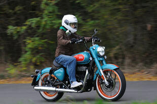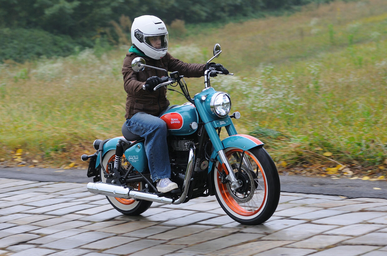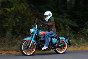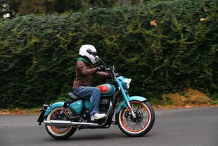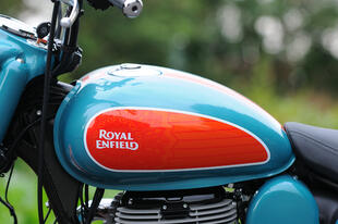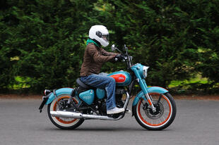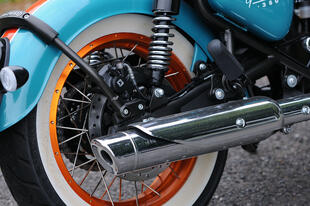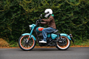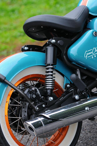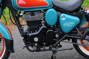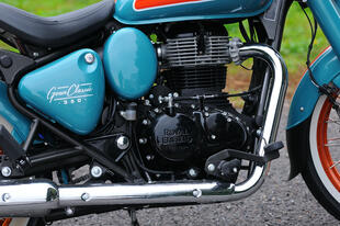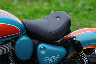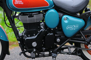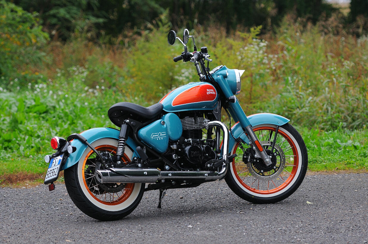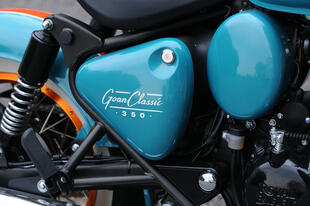 La base tecnica è quella della Classic 350 e delle altre Royal Enfield “piccole”: telaio a doppia culla in tubi di acciaio, motore monocilindrico da 349 cm³, 20 CV e 27 Nm di coppia, raffreddato ad aria e olio, cambio a 5 marce. A rendere speciale la Goan sono le ruote da 19” anteriore e 16” posteriore con gomme a fascia bianca, i parafanghi in metallo più corti e avvolgenti, la sella “sospesa” del pilota (a cui si fissa la sella del passeggero, fornita con la moto), il manubrio rialzato e la livrea turchese-arancio con filetti fatti a mano (riservata solo a questa prima edizione: a EICMA si è vista la versione 2026 in rosso scuro e nero).