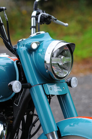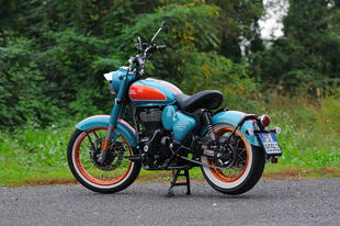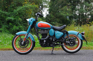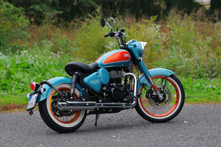 Sembra uscita da una scenografia di Bollywood (la città indiana del cinema), con i ballerini dai costumi vivaci ed eleganti. In effetti questa edizione limitata della Classic 350 nasce per il mercato indiano e celebra il famoso raduno di Goa, un evento equivalente alla Daytona Bike Week... solo che si svolge in India.