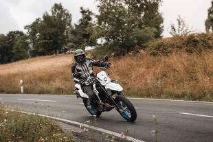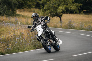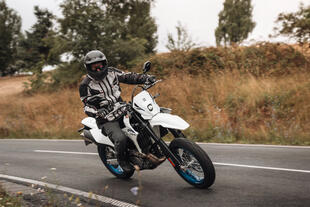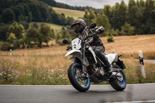 Molto curato anche il pacchetto elettronico: il sistema S.I.R.S. include ride-by-wire, tre mappe motore selezionabili (SDMS), controllo di trazione regolabile su tre livelli (disinseribile) e ABS disattivabile al posteriore. Il telaio a doppia trave in acciaio è stato irrigidito, mentre il forcellone e il telaietto reggisella sono in alluminio. Le sospensioni KYB regolabili offrono un’escursione di 260 mm all’anteriore e sono abbinate a ruote da 17” con pneumatici Dunlop Sportmax Q5A, sviluppati per l’uso stradale. Il faro a LED e la strumentazione LCD semplice ma completa aggiungono un tocco moderno, mentre la sella alta (89 cm) ha un’imbottitura rigida ma permette di toccare a terra con facilità grazie alla forma stretta e alle sospensioni morbide. Il prezzo è alto: 9.700 euro, ben al di sopra della media per moto dello stesso segmento. In parte, tale esborso si può gisutificare con l'evidente qualità costruttiva e la dotazione tecnica, tra le più complete nel settore supermotard.