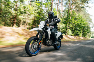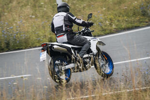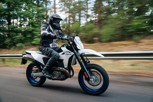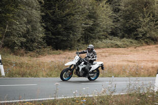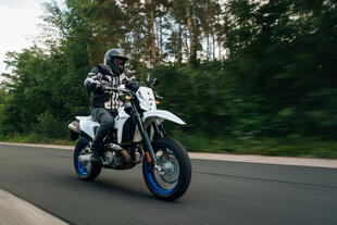 Durante la nostra prova su asfalto bagnato, la DR-Z4SM ha rivelato un comportamento molto equilibrato. La ciclistica è neutra e prevedibile, mai nervosa, con un avantreno sempre comunicativo e sospensioni capaci di assorbire bene le sconnessioni più comuni in ambito urbano. Ottima la reattività nei cambi di direzione, merito anche della ruota da 17” e del baricentro alto. L’impianto frenante con pinza a quattro pistoncini è modulabile e potente, con un attacco deciso ma gestibile. Tra i difetti segnaliamo la mancanza della sesta marcia, utile quando le curve finiscono e c'è da affrontare qualche drittone, e le vibrazioni, presenti soprattutto nella zona centrale della sella.