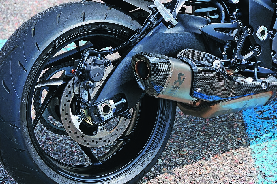 Di serie il terminale di scarico Akrapovic in acciaio con fondello e protezione in carbonio, più leggero e dal timbro grintoso.