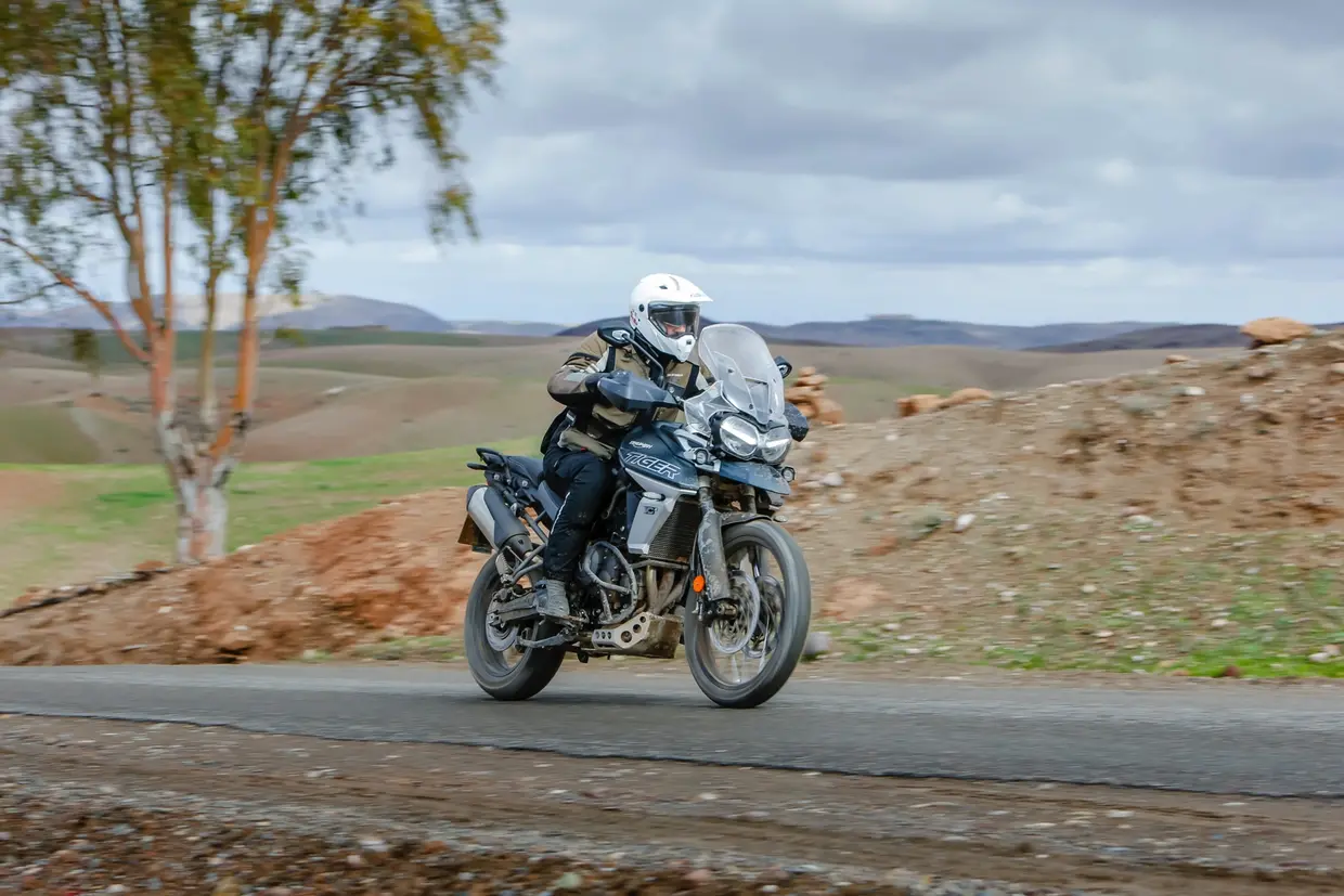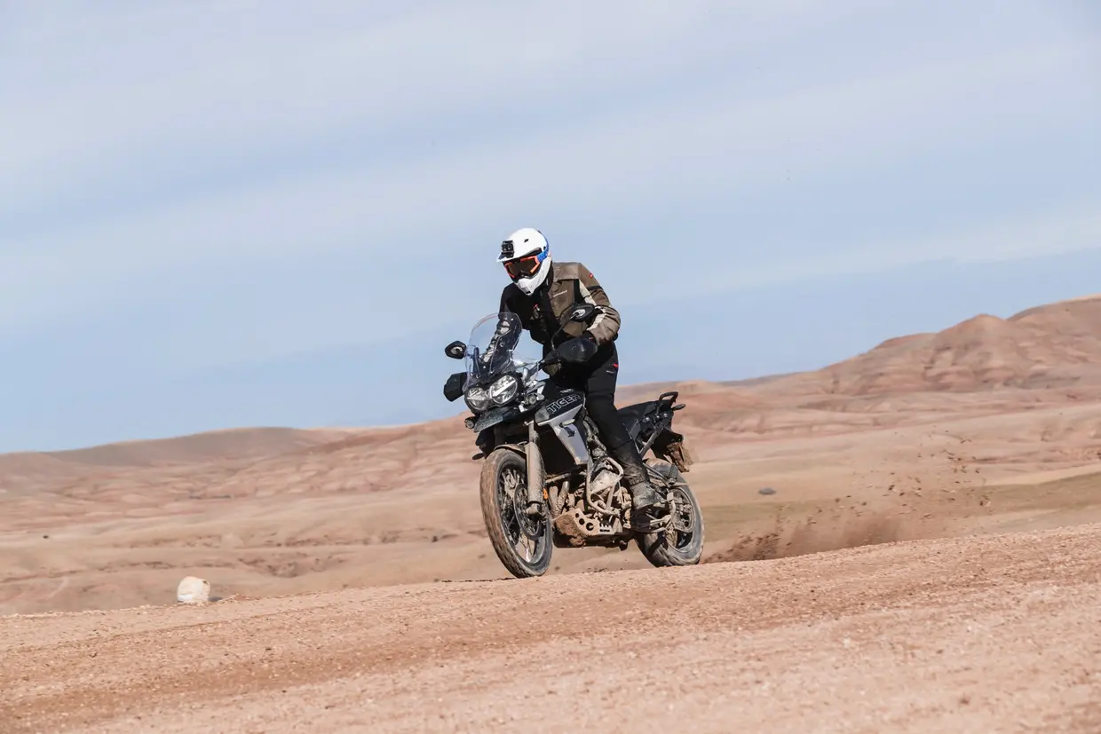 Per dimostrare le doti delle nuove Tiger 800 su strada e soprattutto in fuoristrada, Triumph ha organizzato un test in Marocco, ai piedi della catena montuosa dell'Atlante, con la possibilità di provare anche nel deserto la sua nuova " tuttofare". Alla guida della Tiger 800 XCa (la versione "top" era l'unica disponibile per il test) abbiamo avuto molte conferme e anche qualche piacevole sorpresa: rispetto alle versioni precedenti, l'endurona inglese è nettamente migliorata nella guida offroad. Ora si può decidere se affrontare gli ostacoli con un minimo di assistenza alla guida in modalità Enduro (mantiene attivo l'ABS solo sulla ruota anteriore e riduce al minimo l'intervento del TC al posteriore, per consentire al pilota di derapare dolcemente) oppure se "aggredire" sterrati e piste sabbiose in modo più sportivo scegliendo la modalità Enduro Pro che disattiva completamente ogni forma di assistenza elettronica.