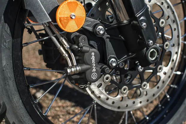 A sinistra, la strumentazione TFT full- colour da 5"; a destra, il nuovo impianto frenante marchiato Brembo.